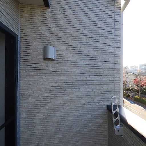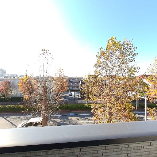 眺望と抜け感(確度86%):道路と並木を望むバルコニーで、前面に高い建物が少なく視界が開けている。
