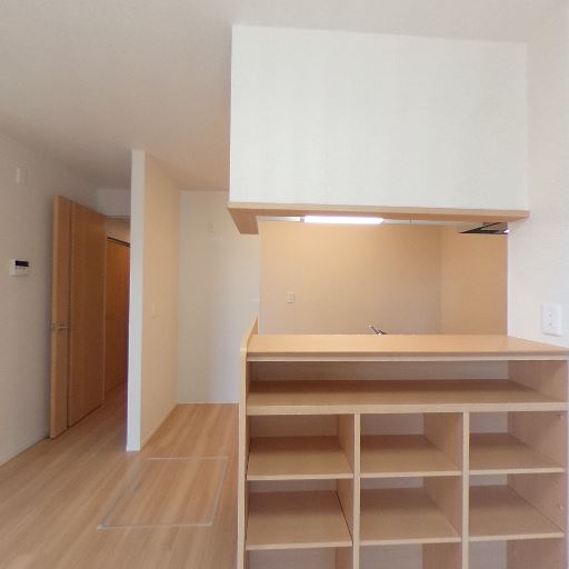 床や壁が比較的新しく清潔感がある(確度79%):床材は明るい木目調で、壁面や棚にも目立つ大きな傷みや汚れは強く見当たらず、全体として明るく清潔な印象である。