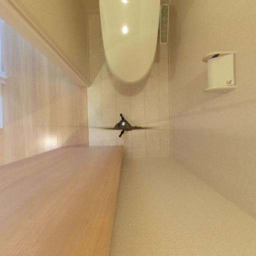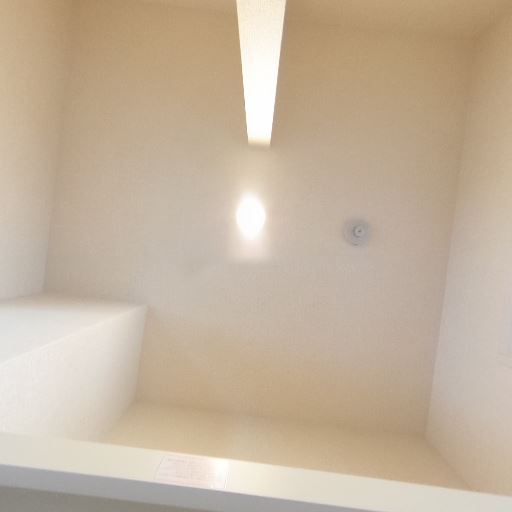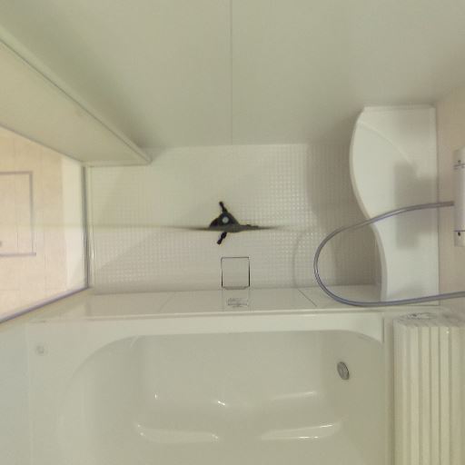 浴槽と洗い場が分かれた使いやすい浴室(確度87%):床面画像から浴槽の外に洗い場スペースがあり、シャワーホースやカウンターも確認できるため、ユニットバスの中でも入浴動線は比較的良さそう。
