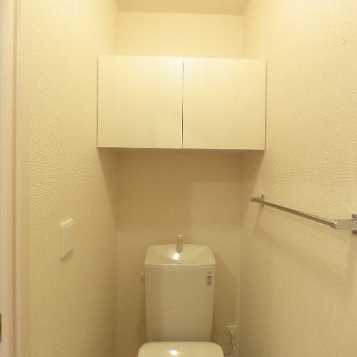 上部収納が備わっている(確度95%):トイレ上部に扉付きの収納棚があり、トイレットペーパーや掃除用品を隠して収納できる構成に見える。