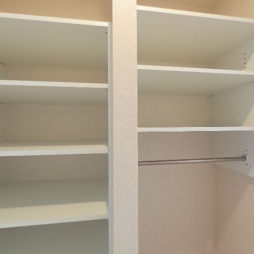 収納力の高いウォークインクローゼット(確度95%):左右に可動棚が複数段あり、加えてハンガーパイプも設置されているため、衣類だけでなく小物や箱物も整理しやすい収納空間と見受けられる。