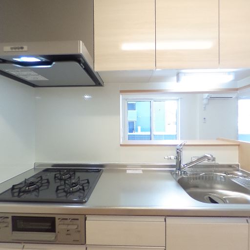 2口コンロと広めの調理・洗い場があり実用的(確度90%):ビルトインの2口ガスコンロがあり、シンクと作業スペースも一定程度確保されている。日常的な自炊には十分そうな設備構成である。