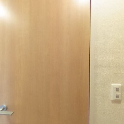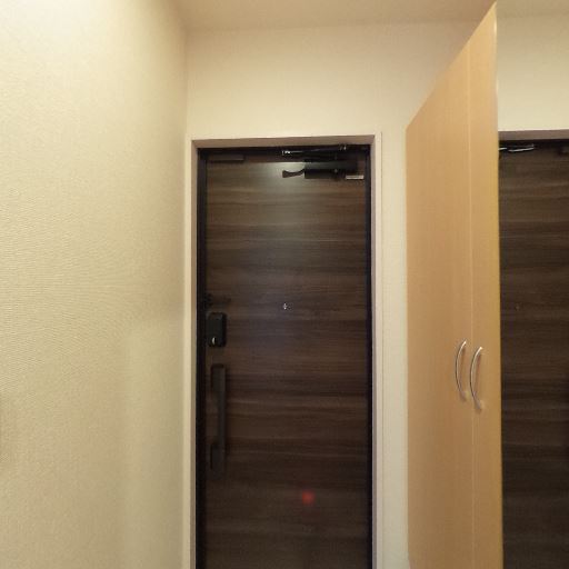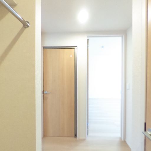 室内側は明るく清潔感がある(確度88%):白い壁と明るい木目の建具・床材で統一され、照明も十分に効いていて玄関から見た印象は明るい。