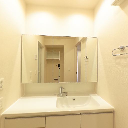 洗面台が広めで使いやすそう(確度91%):一体型の洗面カウンターが比較的広く、三面鏡も設置されている。洗面ボウル脇に物を置ける余白があり、朝の身支度はしやすそうに見える。