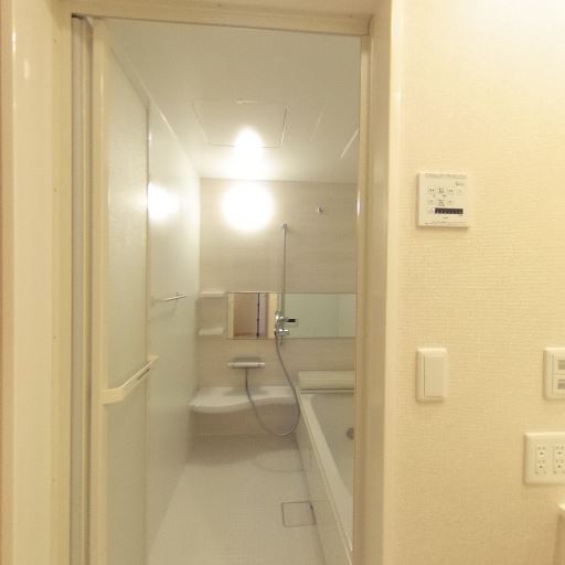 浴室が比較的新しく清潔感がある(確度86%):浴室内は白基調で、壁・床・浴槽まわりに大きな劣化や汚れは目立たない。鏡、カウンター、シャワー水栓などの設備も整っている。