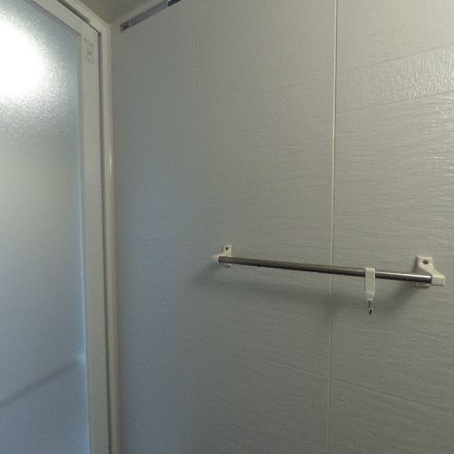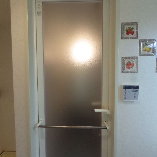 • 浴室扉と手すり(確度86%):すりガラスの浴室扉に横手すりが付いており出入り時の補助になりそう。