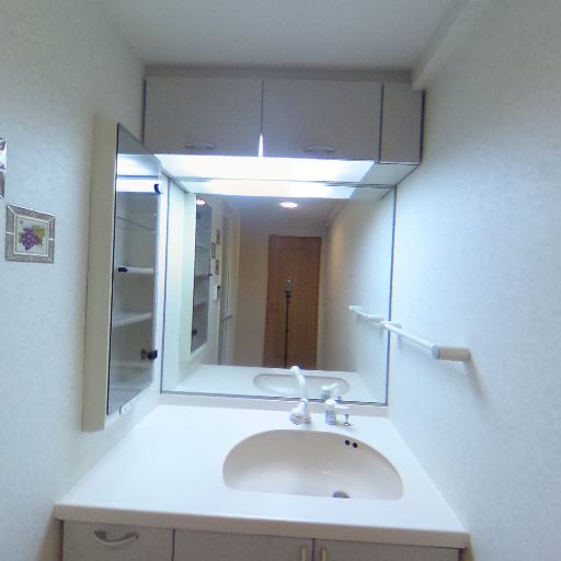 • 脱衣所・洗面所の存在(確度90%):洗面台と大きな三面鏡、上部収納が確認できる。横にはタオル掛けもある。