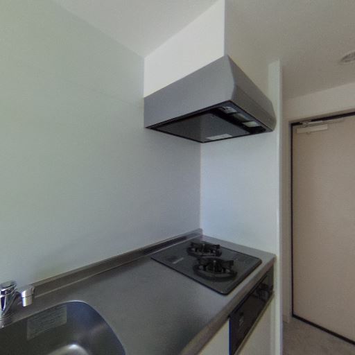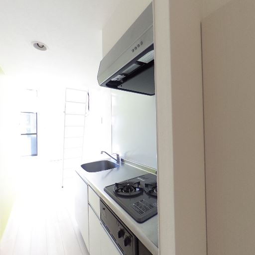 • 2口ガスコンロと換気フード付きのキッチン(確度86%):シンク横に2口コンロ、魚焼きグリル付きらしき設備、上部にレンジフードが見える。
