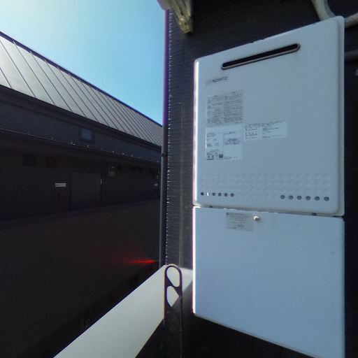 • バルコニー設備(給湯器・室外機)(確度86%):壁面に給湯器、上部にエアコン室外機が設置されている。