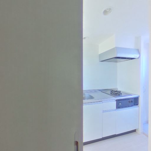 • キッチンが隣接して明るい(確度70%):洗面室のドア外にガスコンロ付きのシステムキッチンが見え、採光も取れている。