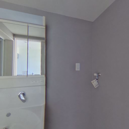 • 独立洗面台と三面鏡収納(確度86%):洗面台はシングルレバー水栓で、三面鏡の裏に収納スペースがある。
