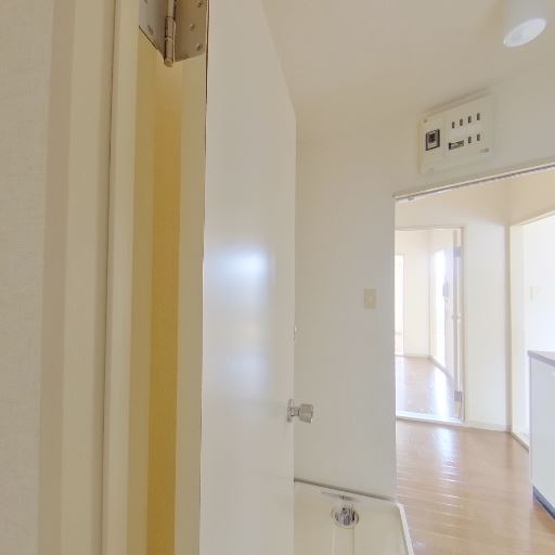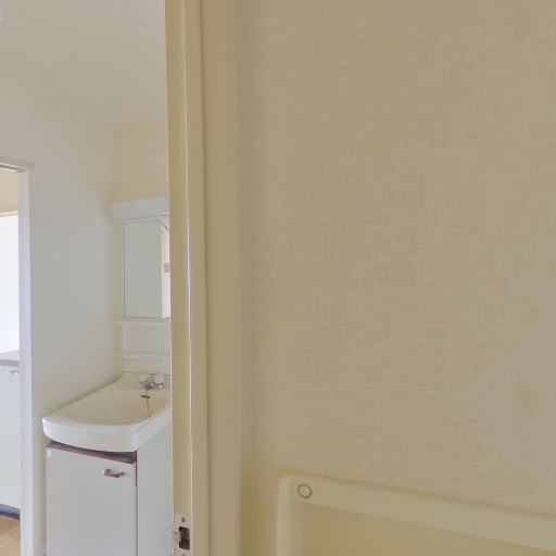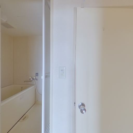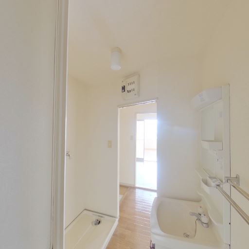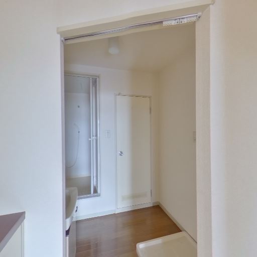 浴室が近接(確度86%):引き戸(またはドア)の先に浴槽とシャワーが見えるため、洗面所と浴室が隣接する一般的なレイアウト。