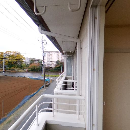 連続したバルコニー・避難ハッチ無し(確度62%):隣戸と連続する共用バルコニー形状で、手すりや床が一続きに見える。避難ハッチは見当たらない。