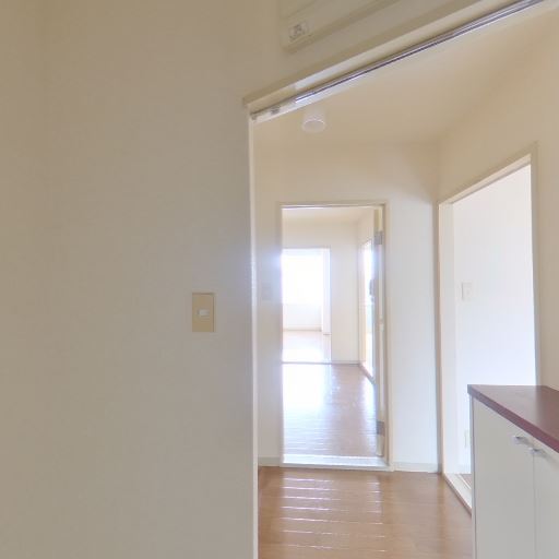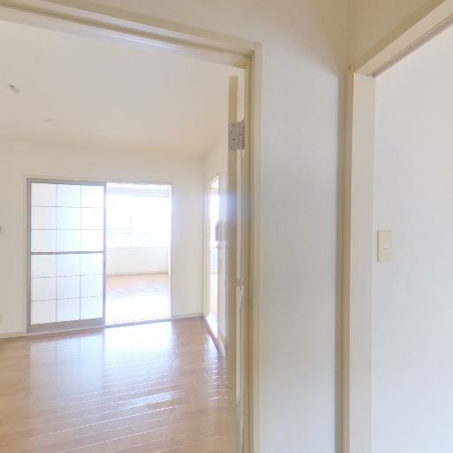 採光と明るさ(確度73%):廊下の先に引き戸付きの明るい居室があり、玄関側まで自然光が届いている。