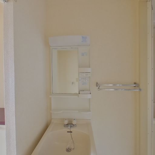 独立洗面台あり(確度88%):鏡付きの独立洗面化粧台が設置されている。小物棚とコンセント、タオル掛けも確認できる。