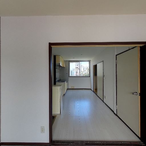 • キッチンと隣接する続き間(確度86%):引き戸の先にキッチンが直接見えるため、リビング兼居室と台所が続き間になっている。