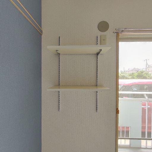 • 可動棚の設置(確度72%):窓横の壁にレール式の棚が2段取り付けられている。小物やWi‑Fiルーター置きに便利。