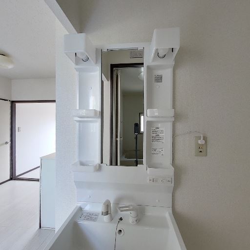 • 独立洗面台あり(確度90%):鏡付きの独立洗面化粧台が設置され、収納棚やコンセントも見える。