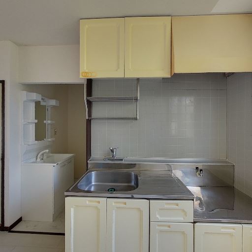 • キッチン設備の状態(確度78%):ステンレス天板とシンクは比較的きれいで、壁面タイルも割れが見当たらないが、吊戸棚の扉に反りや歪みのような段差があり、年季を感じる。