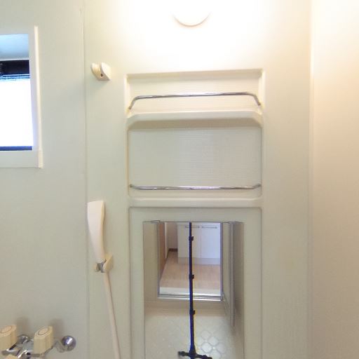 • シャワー・鏡・棚の一体ユニット(確度86%):シャワーヘッドと縦長ミラー、収納棚が一体で配置されている。