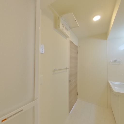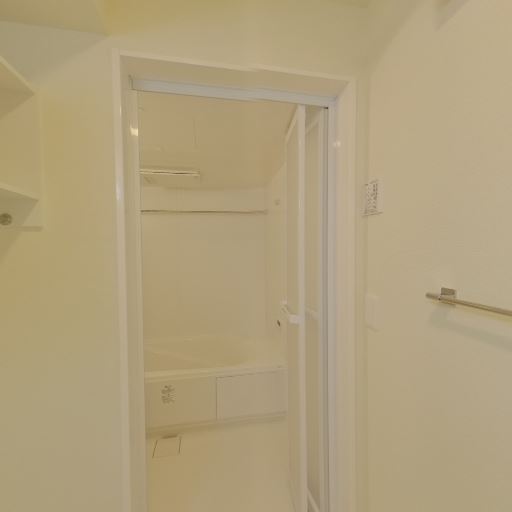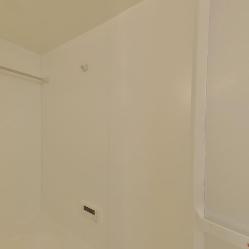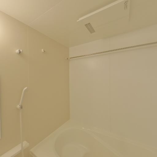 浴室乾燥・換気設備あり(確度90%):天井に浴室乾燥機/換気ユニットが設置されている。物干しバーも浴室内に渡されている。