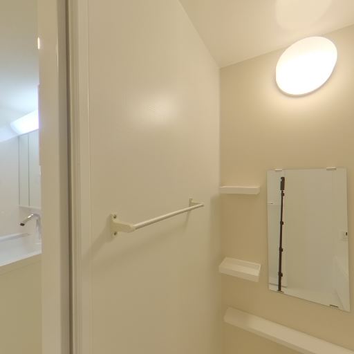 収納・小物置きスペース(確度75%):鏡の横に複数の棚があり、シャンプーや小物を置ける。