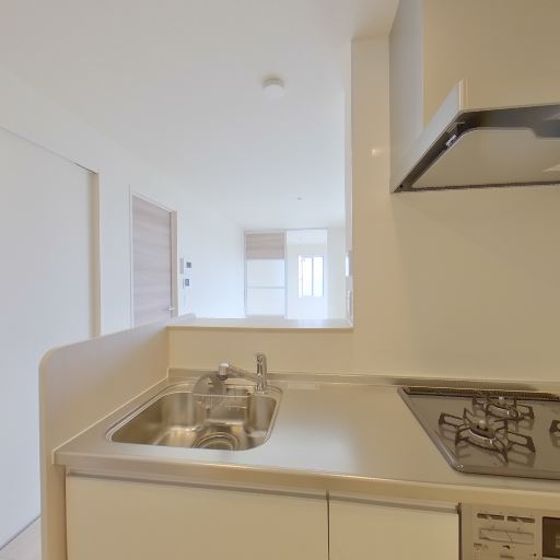 採光は間接的に良好(確度70%):キッチン自体に窓は見えないが、対面の先に開口部があり明るさが届いている。