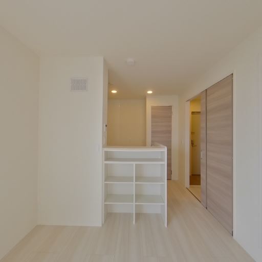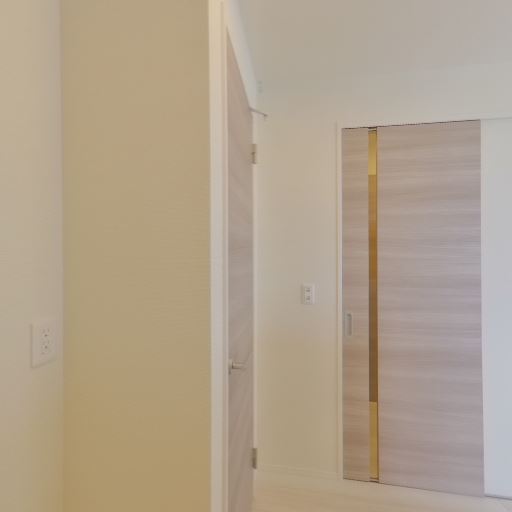 可動式/引き戸による間仕切り(確度82%):木目と白の引き戸があり、奥の空間と区切れる。