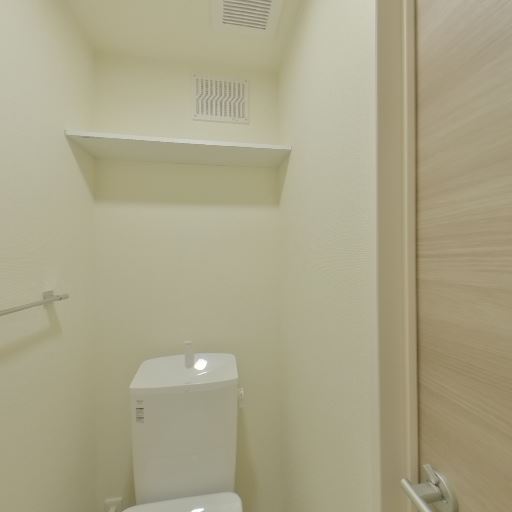 収納棚の存在(確度86%):便器上部に奥行き浅めのオープン棚が1段設置されている。トイレットペーパーや掃除用具の置き場にできる。
