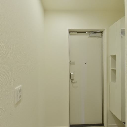玄関収納の有無(確度70%):廊下突き当たりに縦長の扉があり、シューズボックスもしくは物入れがあると推測。
