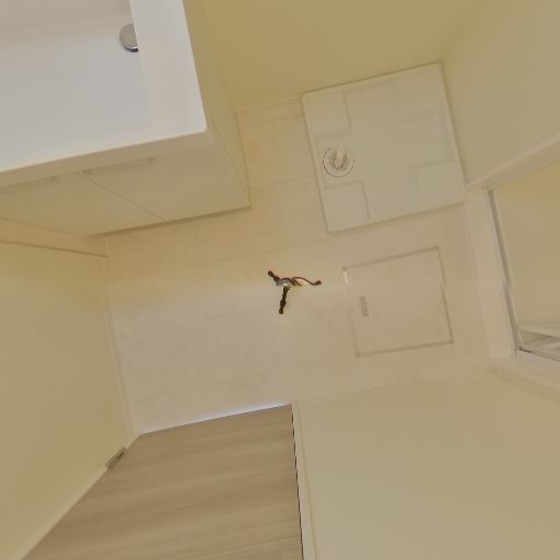洗濯機置き場あり(確度90%):床に防水パンと給水蛇口・排水口の設備が確認できる。