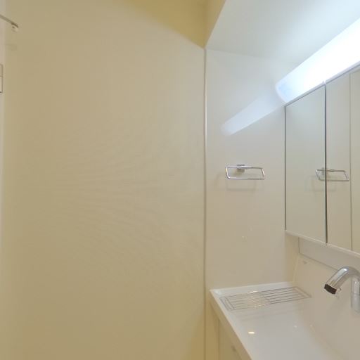 独立洗面台と収納(確度86%):ミラー付きの独立洗面台があり、上部に棚とハンガーパイプ付きの収納が見える。