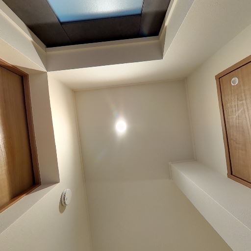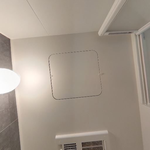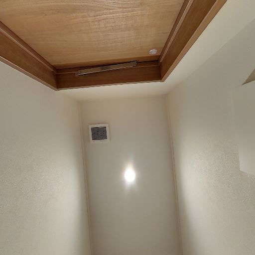 • 設備面(換気・照明・点検口)(確度83%):天井にダウンライトと換気口、木製の天井点検口がある。