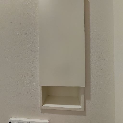 • 収納スペース(確度80%):壁面に埋め込み型の収納(扉付きとオープン棚)がある。
