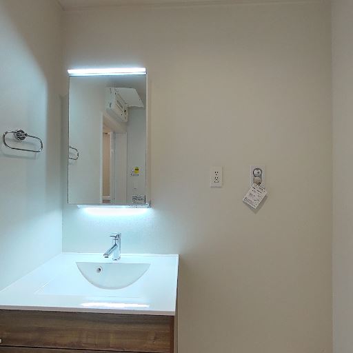 • 独立洗面台と収納(確度86%):鏡付きの独立洗面台があり、下部は木目調の収納キャビネット。新しめで清潔感がある。