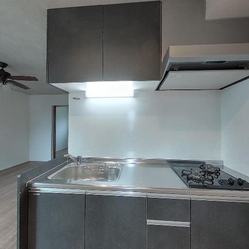 • 対面キッチンと設備の新しさ(確度82%):シンク一体型のステンレス天板、3口コンロ、レンジフード、吊戸棚が見える。面材も傷みが少なく新しめ。