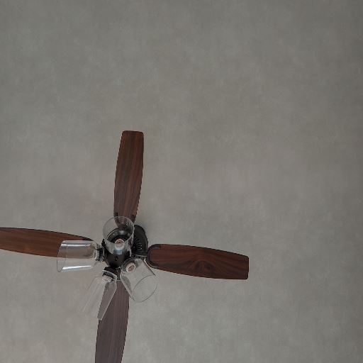 • 天井シーリングファン照明(確度90%):天井中央に木目ブレードのシーリングファン一体型照明がある。