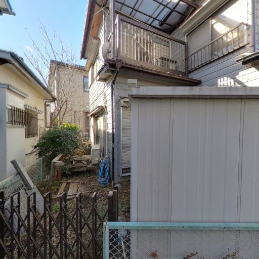 屋外物置・庭スペースの活用(確度72%):小さな物置や庭スペースがあり、ガーデニングや収納に使えそうだが雑草や散乱物が見られる。