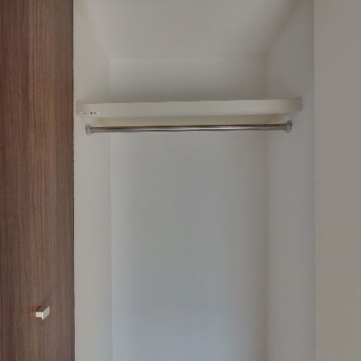 収納(クローゼット)(確度84%):ポール付きの奥行きがあるクローゼットがあり、上部に枕棚もある。扉は木目調の引き戸。