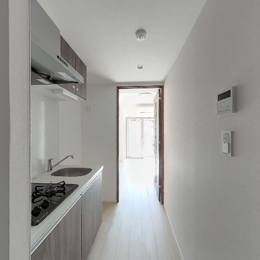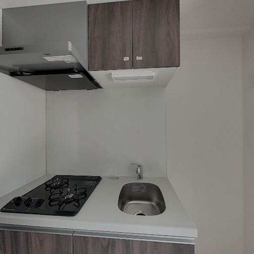 単身向けのコンパクトキッチン(確度90%):2口ガスコンロと小型シンクの直列型キッチンで、作業スペースは限られる。