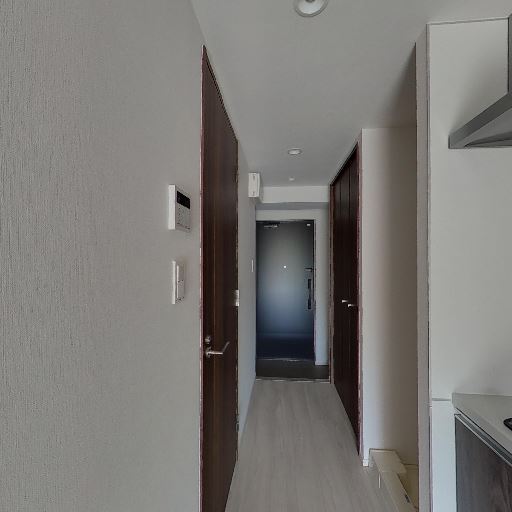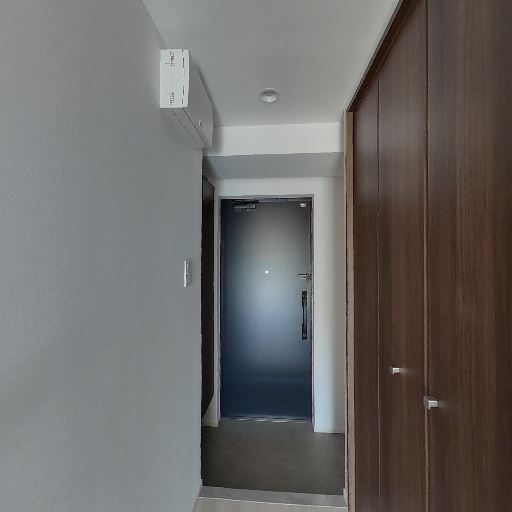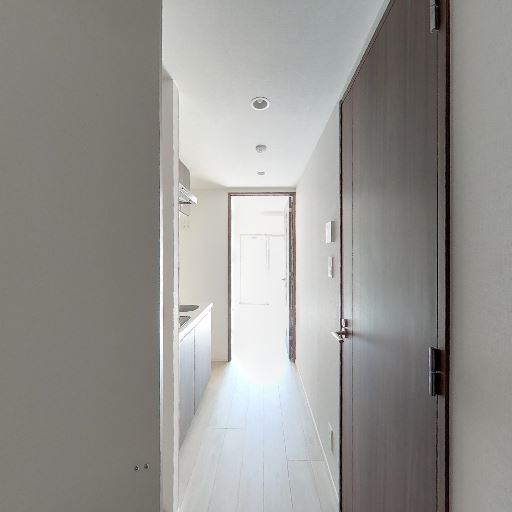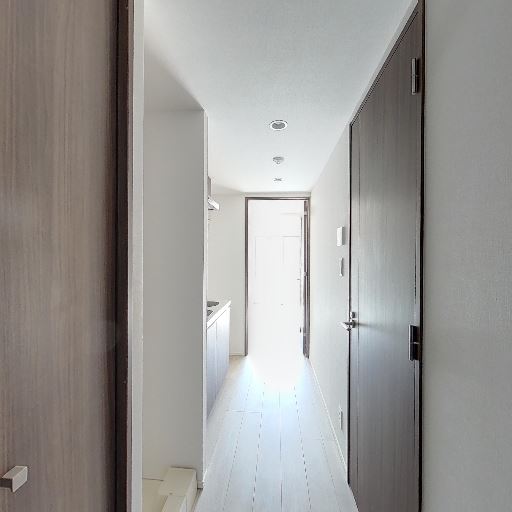 玄関からの動線と収納の気配(確度74%):廊下が一直線で奥に玄関扉。右側に背の高い収納扉が見える。