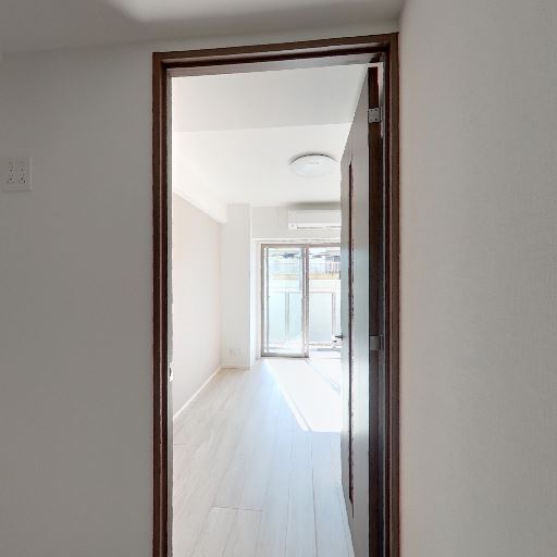 玄関からの直線的な動線(確度74%):玄関扉から廊下がまっすぐ居室・バルコニー側まで続いており、視線が抜けている。採光は廊下奥から入っている。
