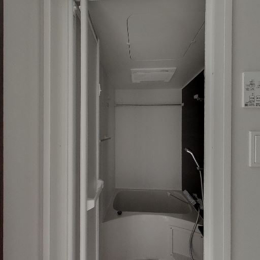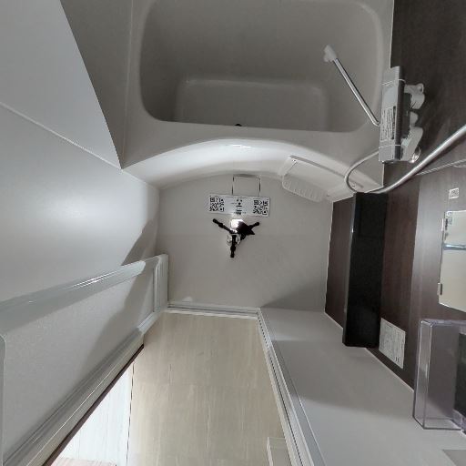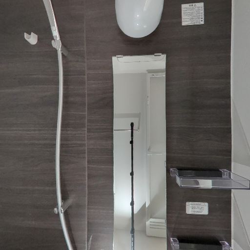 ユニットバスで設備が新しめ(確度82%):浴槽・壁パネル・鏡・棚・シャワー・換気乾燥機などが揃ったユニットバスで、傷や黄ばみがほぼ見られない。