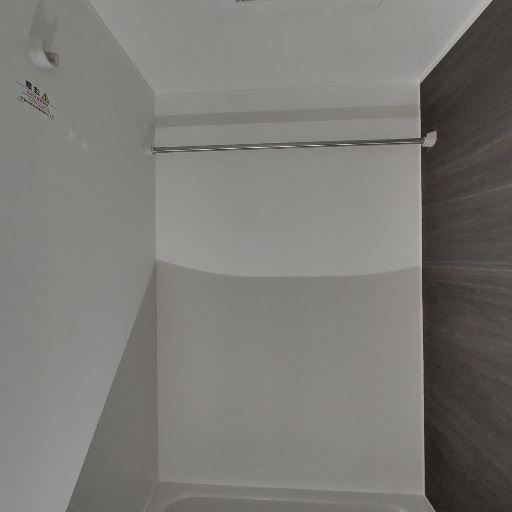 浴室乾燥・物干しバーあり(確度86%):天井に浴室乾燥機の吹き出し口と、横一文字の物干しバーが設置されている。