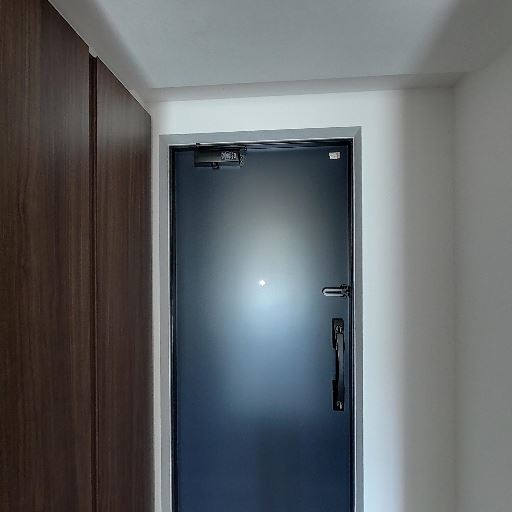 玄関ドアとセキュリティ(確度83%):スチール製の玄関ドアでドアスコープと内側ハンドルが見える。ドア上部にドアクローザーも確認できる。