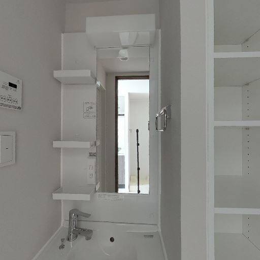 収納棚が豊富(確度90%):可動棚の収納が洗面所まわりに複数あり、タオルや日用品を整理できる。