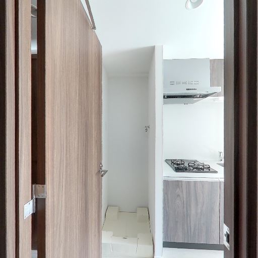 洗濯機置き場とキッチンの近接(確度86%):引き戸の先に洗濯機パンがあり、そのすぐ右にキッチンが見える。家事動線が短い配置。