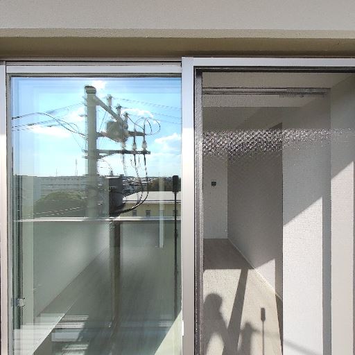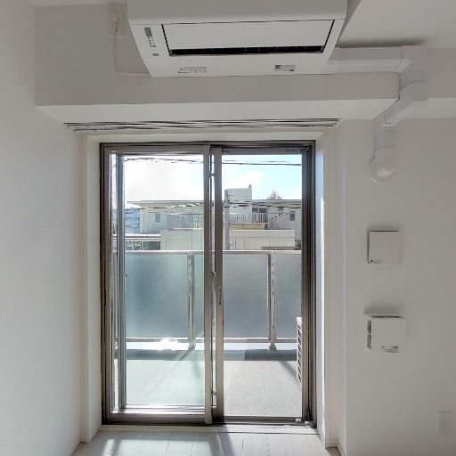エアコン設置済み(確度88%):窓上部にエアコン本体が見える。配管もきれいに納まっている。