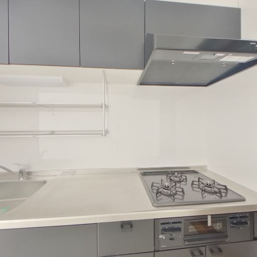 キッチン設備が充実(確度90%):3口ガスコンロと魚焼きグリル、レンジフード、シンク横の作業スペース、吊戸棚とオープン棚が確認できる。