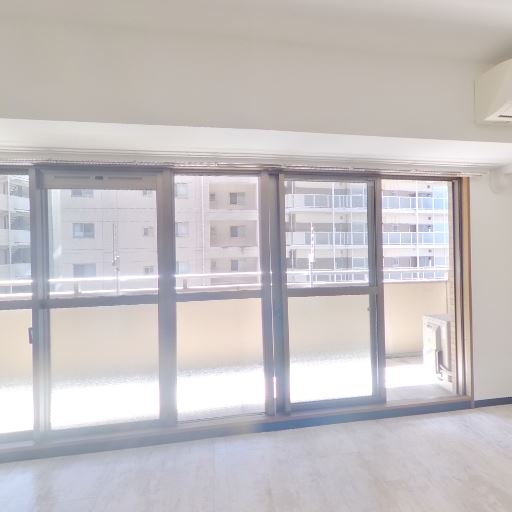 採光が良好(確度86%):ワイドスパンの掃き出し窓とバルコニーから強い自然光が差し込んでいる。室内は全体的に明るい。